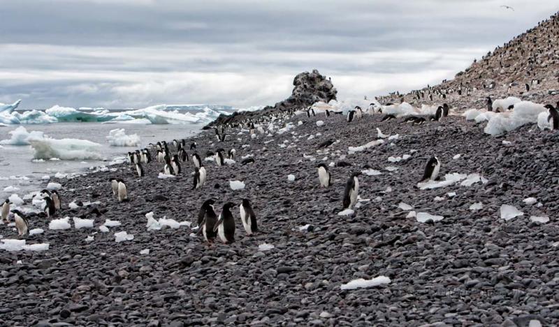 Paulet Island's wild coast near the northern tip of the Antarctic Peninsula. This volcanic island in the Weddell Sea is the nesting ground of Antarctic Shags and a large colony of Adelie Penguins. 01-20-09
